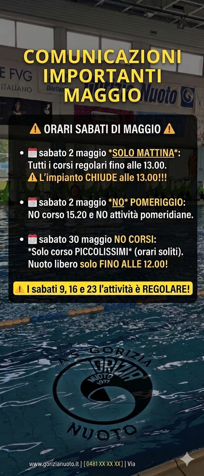 📢 Comunicazioni importanti – Maggio ⚠️ Orari dei sabati di maggio Sabato 2 maggio – solo mattina Tutti i corsi regolari fino alle 13:00. L’impianto chiude alle 13:00.