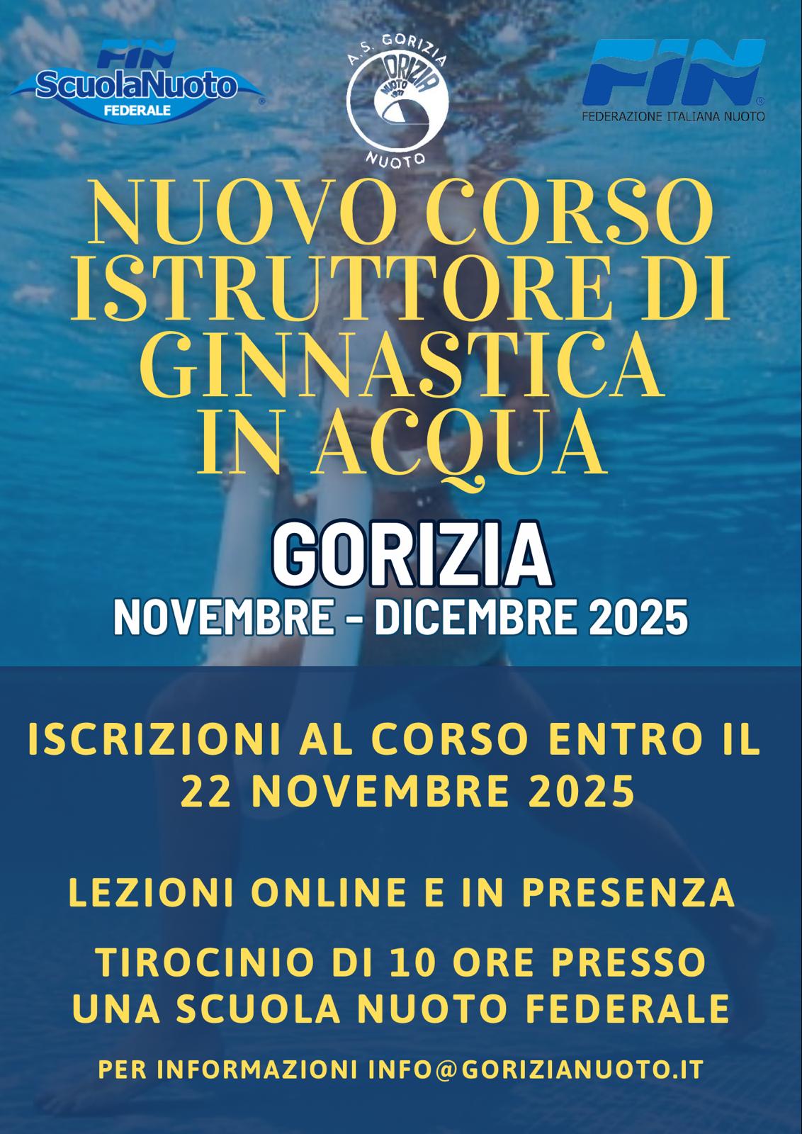 10 Novembre, 2025 Donatella Gorizia Nuoto Formazione, News CORSO ISTRUTTORE DI GINNASTICA IN ACQUA CORSO ISTRUTTORE DI GINNASTICA IN ACQUA, ISCRIZIONI ENTRO IL 22 NOVEMBRE. Info in segreteria. Info SHARE